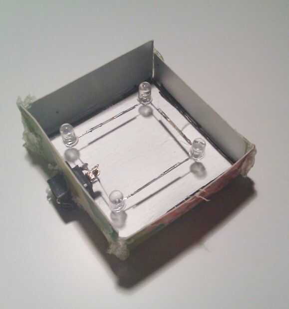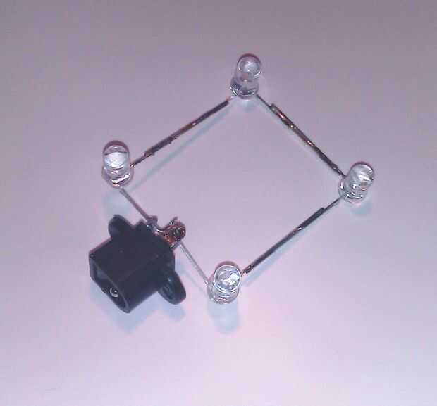 De la soldadura de los cuatro LEDs en serie a un enchufe de 12V. Hacer un agujero para la clavija en el molde base. Pegarlas con el pegamento caliente del derretimiento, que será fácil de quitar más tarde.