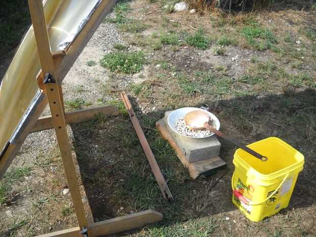 con un gran espejo parabólico y una lente de Fresnel para la cocina solar, esta receta de la familia se completó en 20 minutos. La lente de Fresnel se utiliza para cocinar superior en una sartén de hierro fundido negro. Los camarones y las vieiras so