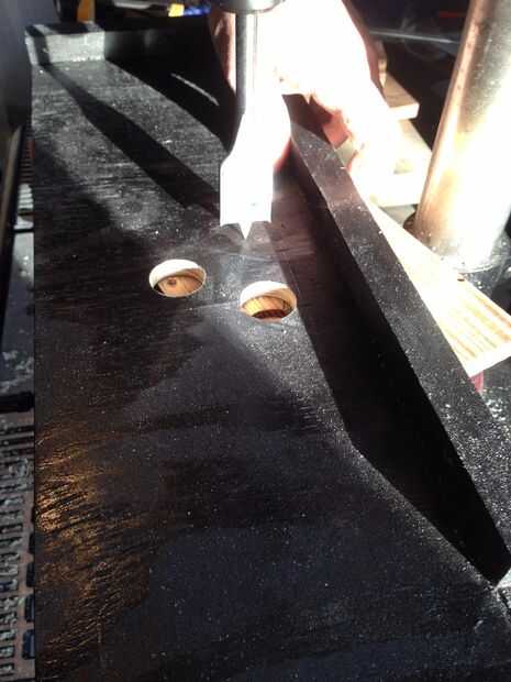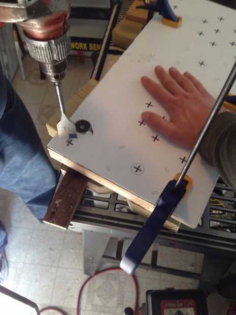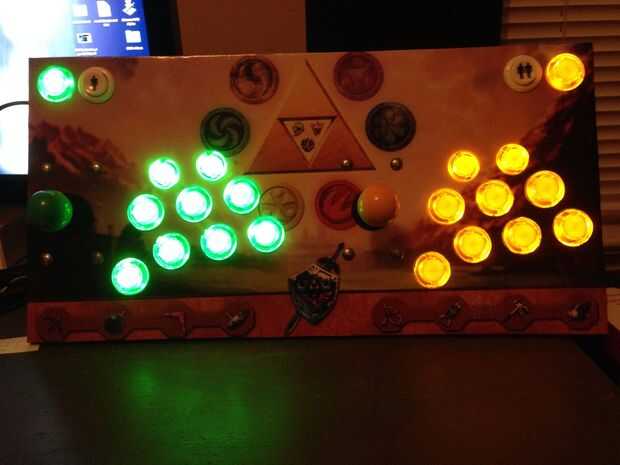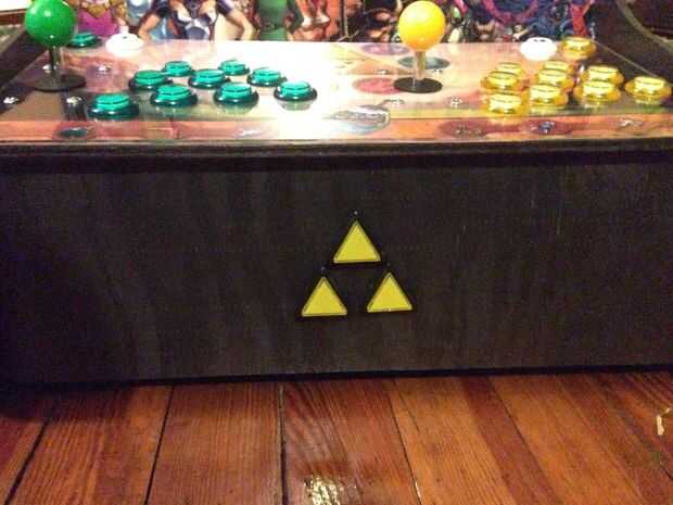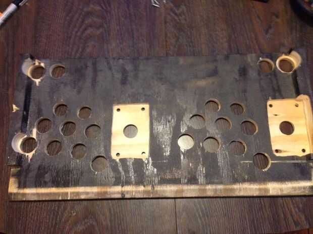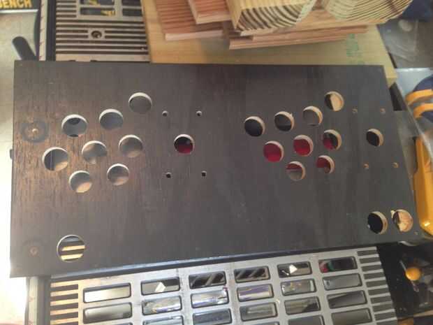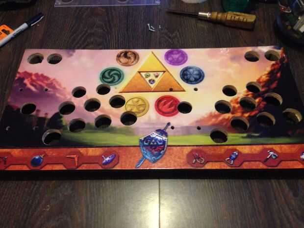 Usando la plantilla, agujeros fueron perforados con un taladro para los botones y palancas de mando. Canales en la parte inferior fueron encaminados por los joysticks en, así como las secciones de los soportes para permitir la ridícula cantidad de botones en un espacio tan pequeño. Los agujeros para la Trifuerza frontal se perforaron en este tiempo también.