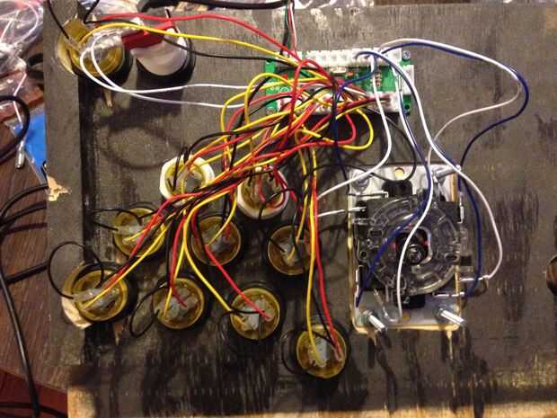 Apliqué la calcomanía de tablero de control después de que los agujeros fueron perforados y los agujeros en el vinilo de corte de la mano con un cuchillo Xacto. Entonces se unieron todos los botones y el cableado conectado al USB codificador. Los botones de triángulo se instalaron en la parte delantera mientras que el tablero de control, después todo lo pone detrás juntos.