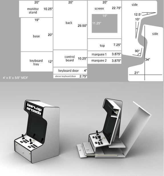 Encontré este plan gabinete en línea en este sitio. No está claro de qué es lo que, pero pensando no era increíblemente difícil. Había marcado las piezas en la imagen adjunta como referencia. Cabe señalar que yo nixed la bandeja para el teclado, por lo que el panel frontal donde que hubiera sido es una sola pieza.