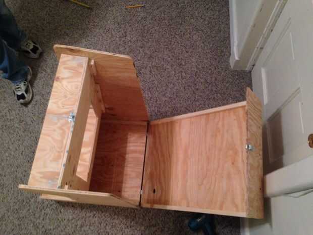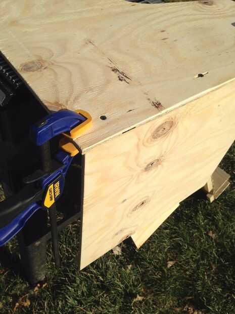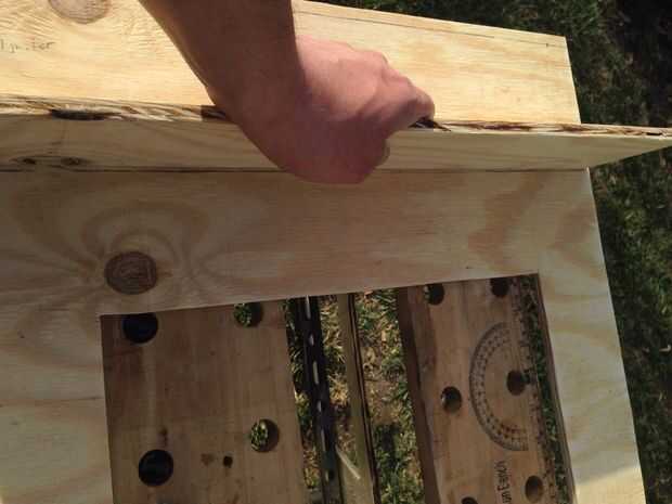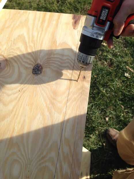 Luego vuelva a colocar las piezas en la sección lateral con pegamento para madera y utiliza los tornillos para fijarlos al lado. Después de que las piezas fueron conectadas a un lado, puso del otro lado en la parte superior y hasta alineó con el otro lado. Se utilizó la misma técnica de rastreo de las llaves, agujeros fueron perforado, madera pegamento y tornillos para madera se utilizaron para conectar el lado.