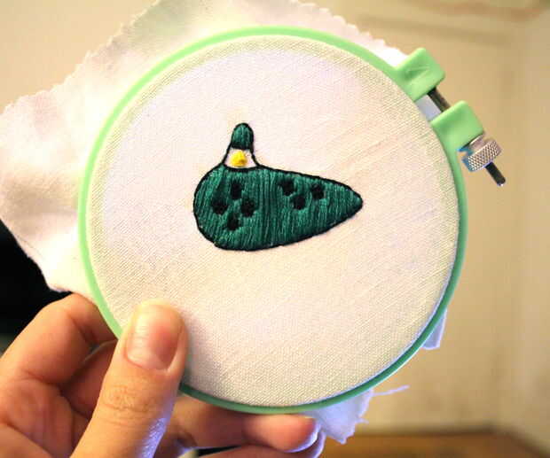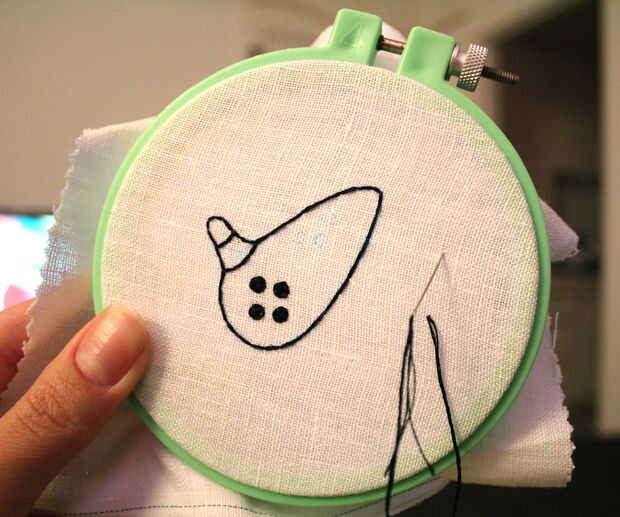 Pespunte con negro alrededor de los bordes, y luego satén coser los orificios de la ocarina con negro. Coser una pequeña triforce (realmente, un triángulo, jaja) en la banda alrededor de la boquilla. Luego rellena el cuerpo y la boquilla con el color.