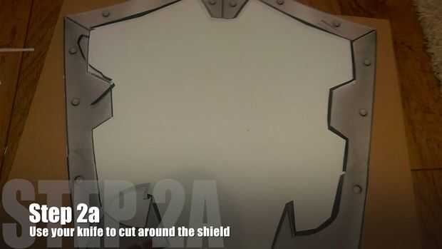 A continuación, usando su tabla de cortar para proteger su piso/mesa/cocina, utilice su cuchillo para cortar alrededor de los bordes exteriores e interiores del borde del escudo.
