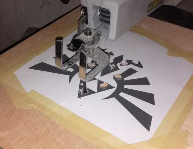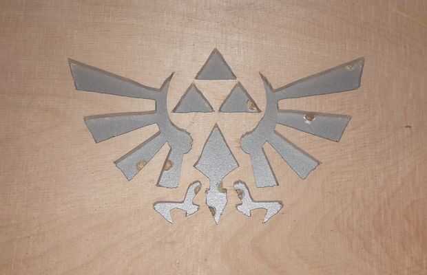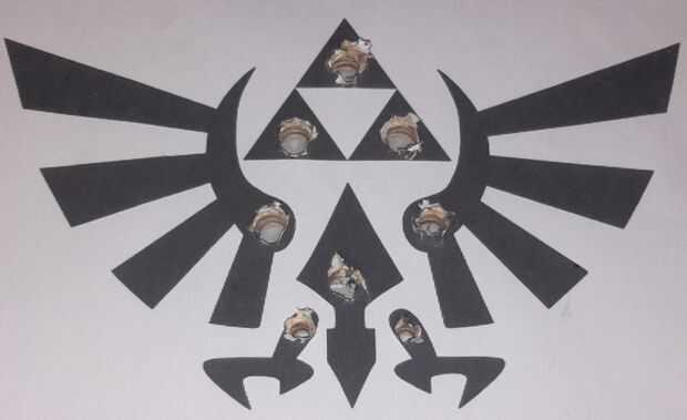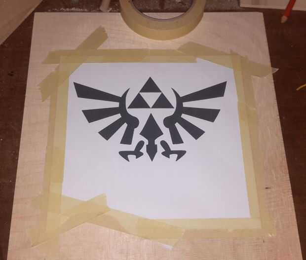 En primer lugar, diseñar el frente de la carpeta. Utilicé el conocido símbolo de LoZ, pero eres totalmente libre de tomar lo que quieras. Usted debe elegir el diseño dependiendo de tus habilidades y herramientas, cortes curvos son más difíciles de hacer que los rectos.