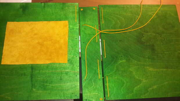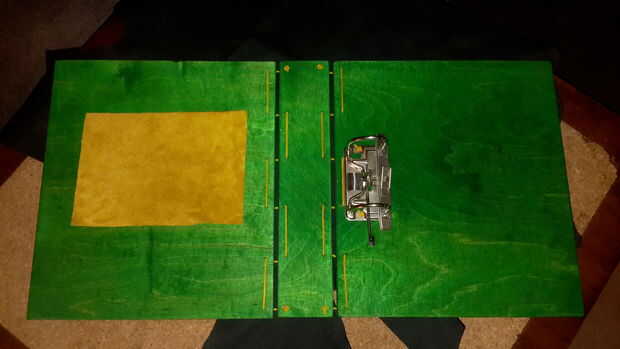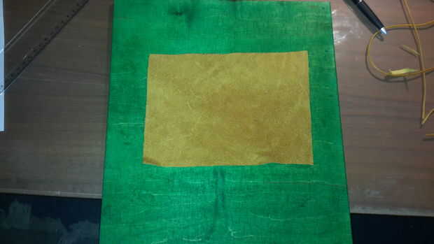 Para enfatizar el símbolo en la parte delantera he decidido pegar un pedazo amarillo de cuero en el interior. Podría utilizar cualquier otro material de papel a la tela, también.