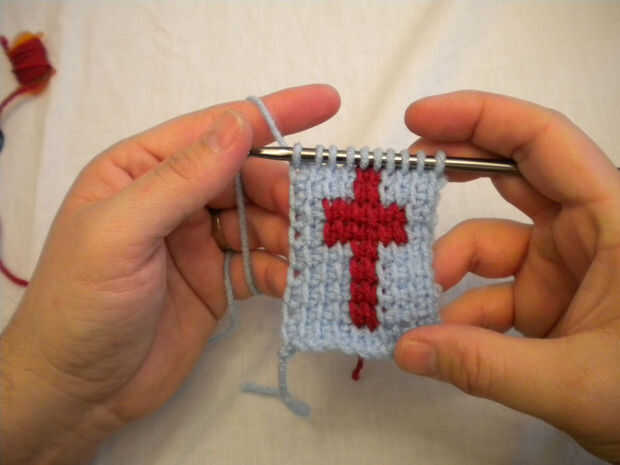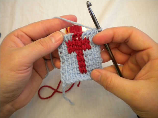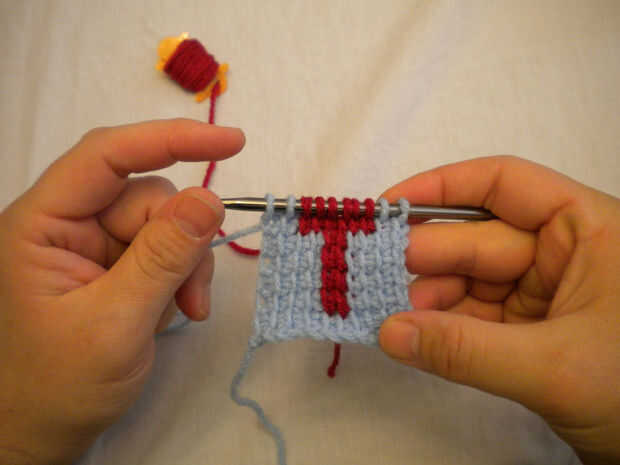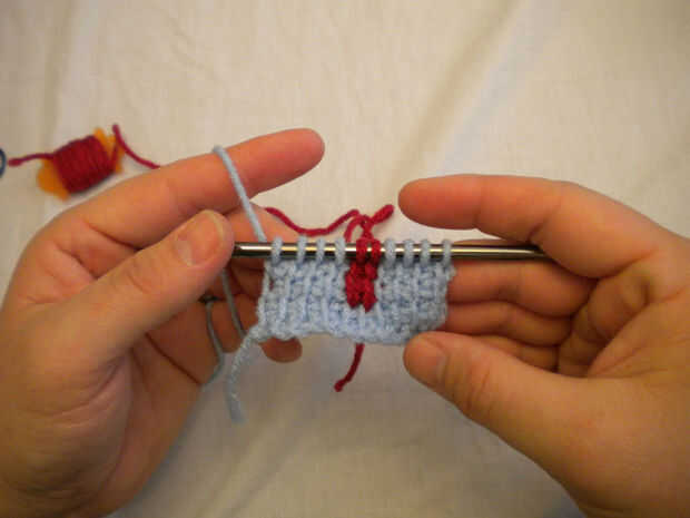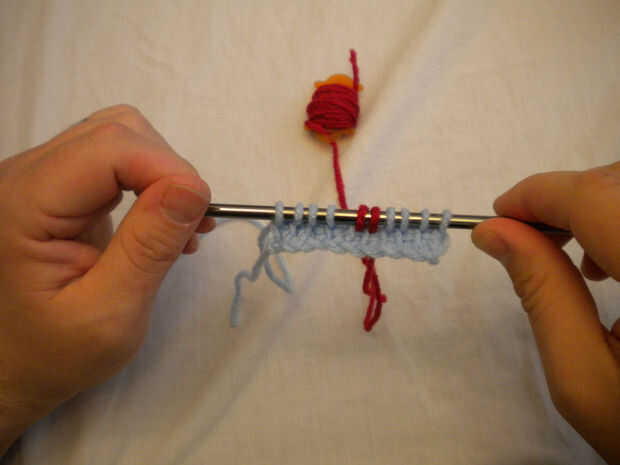 Cuando se llega a una caja de color diferente en la tabla, tienes que cambiar los colores de hilado. Simplemente lazo el nuevo hilo sobre el gancho y tirar a través.