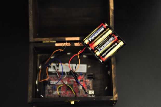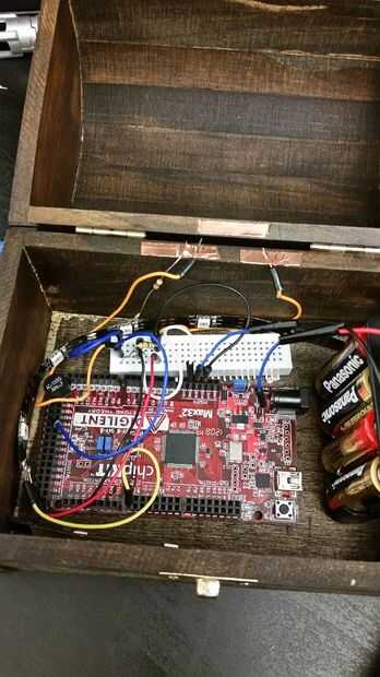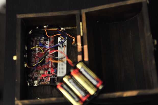 Lo primero a tener en cuenta al configurar el pecho es el circuito de todo dentro. La parte principal que necesita preocuparse es el botón Configurar. La razón por esto es una gran preocupación es porque he utilizado el pecho real como un botón. Cuando la tapa se cierra el botón es apretado. Cuando la tapa está abierta no se ha presionado el botón. Es una gran manera de obtener el tiempo correcto para cuando el usuario abre la caja.