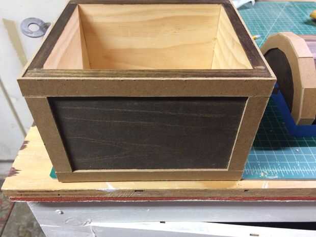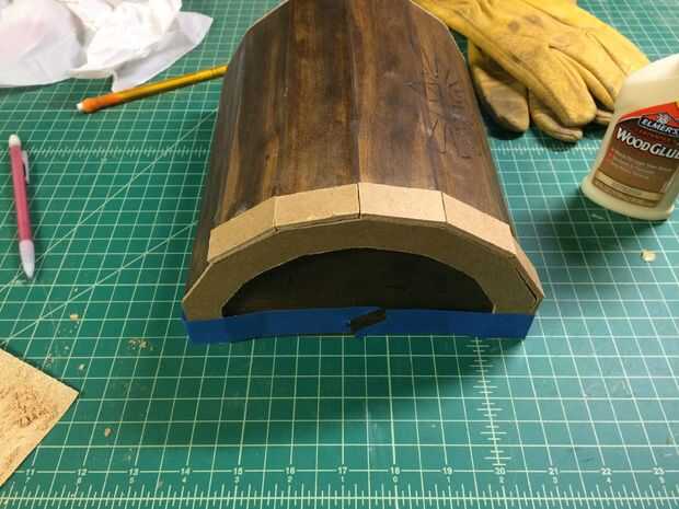 Considera real acero bandas sin embargo esto está destinado a ser un joyero o una caja de maquillaje para que no lo quiero a pesar una tonelada. Estoy pensando en hacer una versión mucho más grande cuando tengo el tiempo que probablemente habrá soldado con autógena acero de bandas. Para este pequeño cofre usé 1/8 tablero de aglomerado (Masonite) cortado en tiras de 3/4". Es muy fácil de trabajar pero lijado es lento porque tienes que usar grano fino o simplemente terminan rasgándose las capas, como el papel. En este punto las tiras de madera sólo que se pegan en.