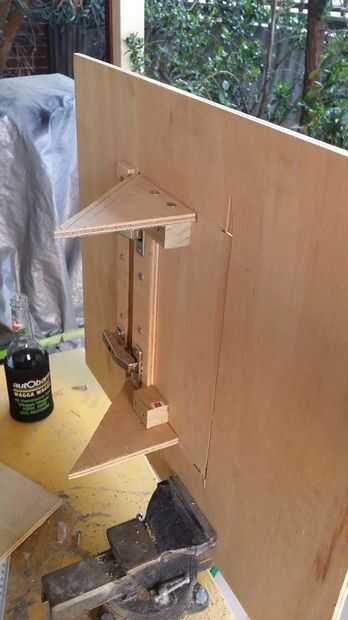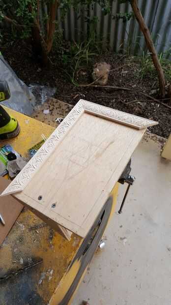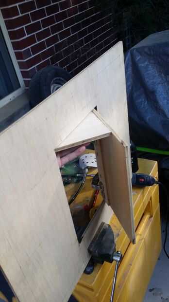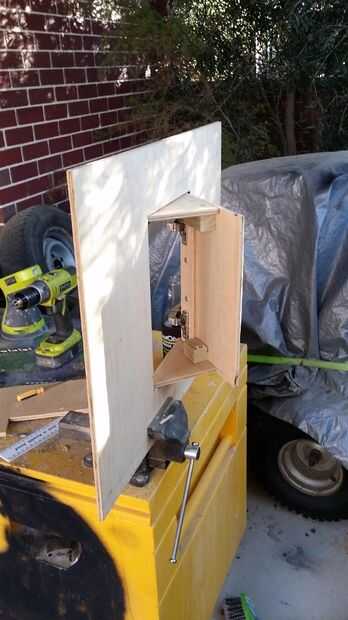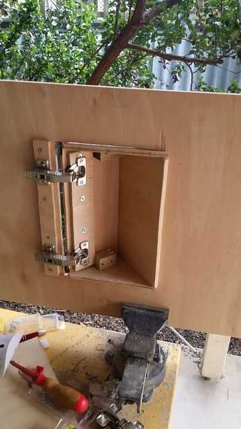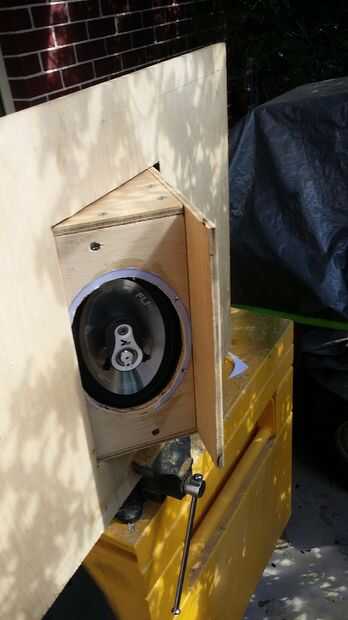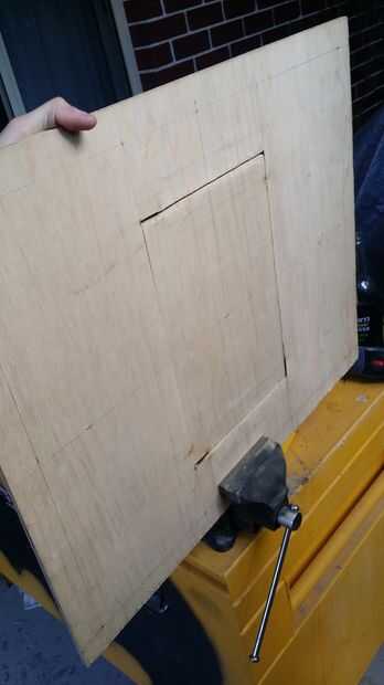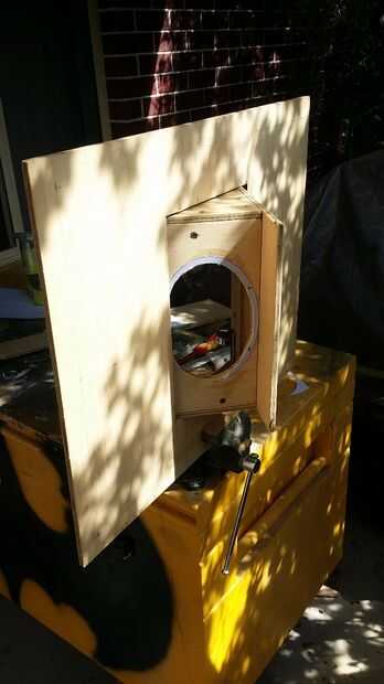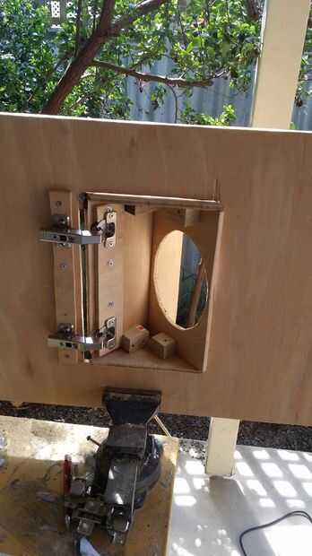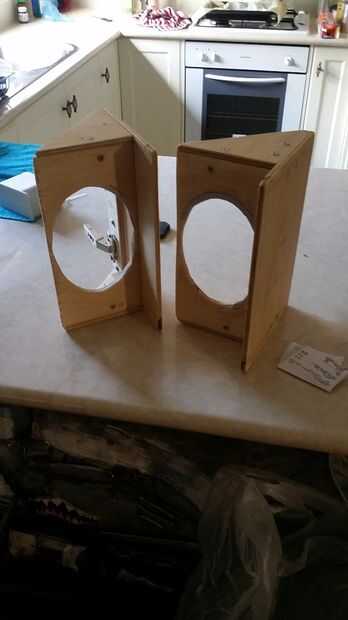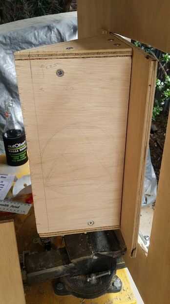 Quería a los lados para doblar hacia fuera para ocultar o mostrar los altavoces. empecé con contrachapado marino. Corte los lados cuadrados y elaboró lo que necesita para cortar. tomó un poco de elaboración y jugando para obtener las dimensiones bien speakr todo viene a través del agujero y en un buen ángulo de audio. una vez que tenía la parte interior corte poner las bisagras en que elegir cómo es grande para permitir que se abra. Utilice un poco de cartón para obtener los ángulos derecho (fácil de seguir cortando pedacitos de nuevo hasta el tamaño adecuado). la parte central donde el orador viene a través. Cuando edificio Asegúrese de que el centro de los lados tiene suficiente espacio libre para cuando el material se añade a los lados, abrir y cerrar muy bien. bisagras de puerta de armario usado. Tómese su tiempo. los dibujos explican el proceso mejor que yo. Comience con el lado de tamaño completo y trazar el rectángulo y utilice una broca de tamaño pequeño para obtener espacio suficiente conseguir el juego para obtener una forma de rectángulo bonito. Unos 3mm de la abertura para hacer espacio para el material (si es la arena fuera más está bien se ocultarán) de arena