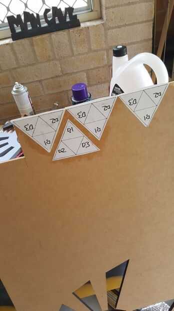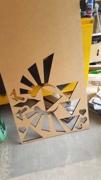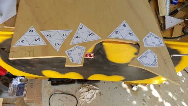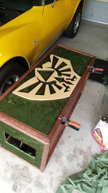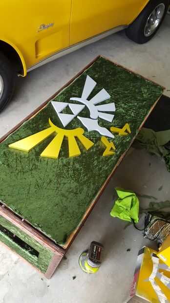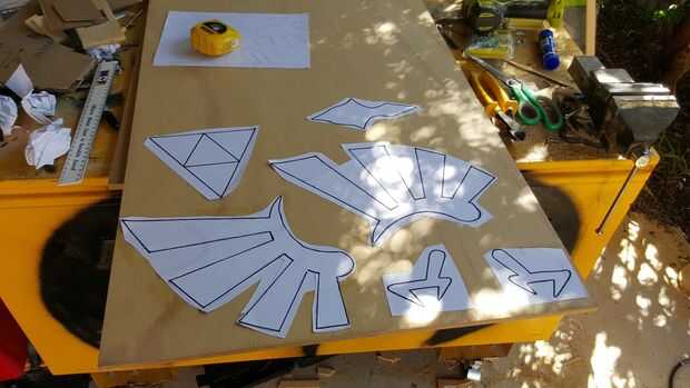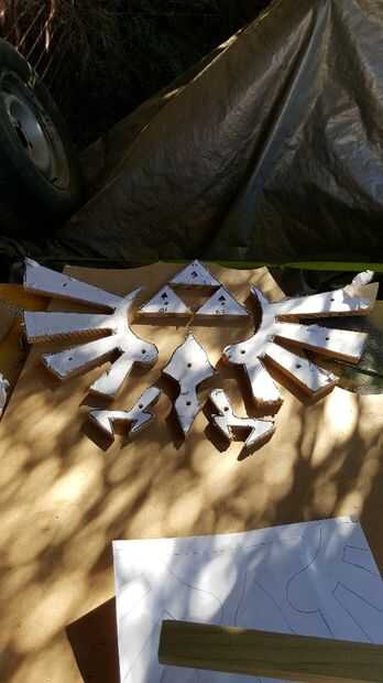 Oh ahora se trata de un cuento y un error. Empecé imprimiendo algunas plantillas de la red y pegar sobre algo de madera (por alguna razón que corte de madera contrachapada). Corté todo con un router y Sierra de calar y comenzó detrás de la arena y todos los bordes del planos y agradables, después de una feria pocas horas me di cuenta que hubiera gastado semanas lijado esto pedacitos y nunca ser feliz con ellos, es sólo unas pocas semanas hasta rotura de Navidad donde iba regresar a ver a la familia. por suerte un gran compañero mío allí posee una lasercutting/compañía de la máquina. durante las vacaciones tengo que cortar todo lo que necesitaba. resultó gran. Aunque no fue hasta que llegué a casa y poner los bits en ver tamaño y yo puedo haberle dado el tamaño incorrecto para todos los triángulos más pequeños. así que tuve que elaborar y cortar los triángulos yo mismo. Mi compañero que corta las piezas con la lasercutter corte el símbolo de hyrule para que utilizaría como plantilla para pegar (su idea era pero agrande uno, guardado tanto tiempo)