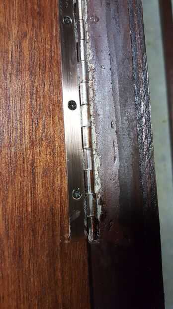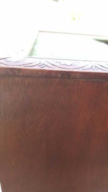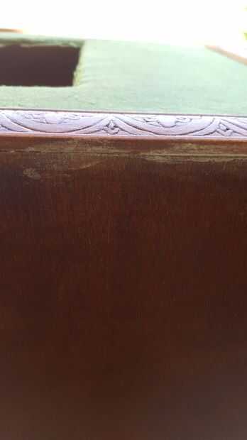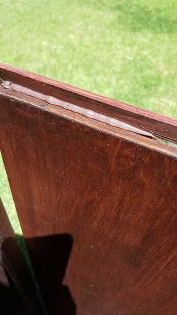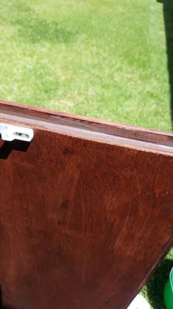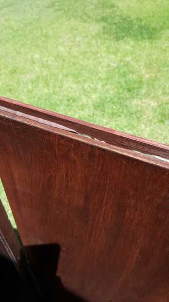 Muchos de los bordes entre el marco roble tendrá un boquete donde está el material. arena de regreso cualquier exceso de pegamento y rellenar con una tiza de color cercano, aunque utilicé barniz cedro la tiza de cedro fue lo suficientemente oscura, usé un color marrón más oscuro. agrega a la mirada rústica. Rellene los bordes y utilizar un dedo húmedo para alisar la tiza para obtener un buen acabado liso.