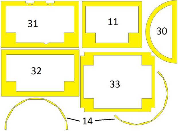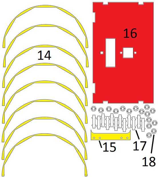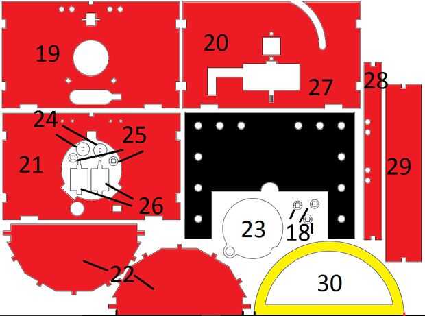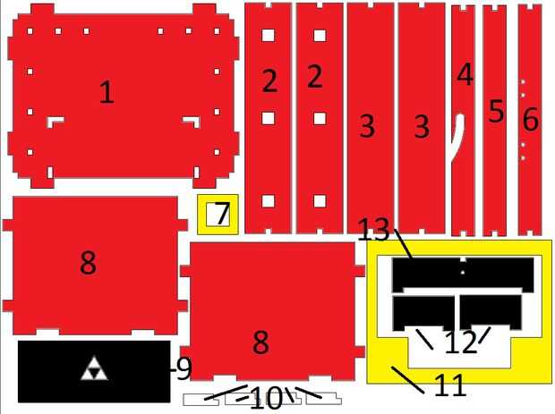 Pintar las piezas según estos planos. Si no tienen un relleno en los planos, no pintar esa parte. La clave con la pintura en aerosol oro de la pintura. Pintar un lado de negro parte #8 y el otro rojo.