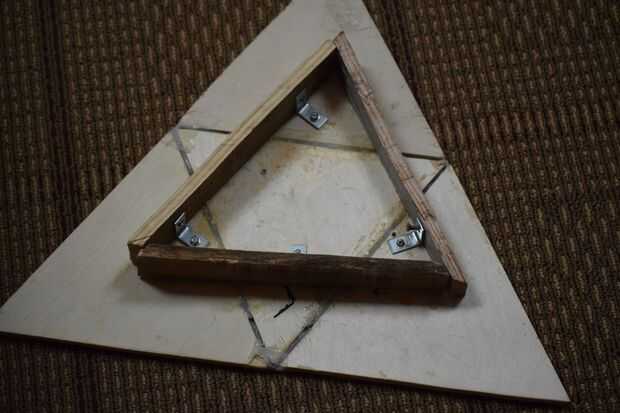 • Coloque el triángulo que hicimos de las piezas de 7 pulgadas en el centro de la Trifuerza. Ahora toma los enlazados y asegúrese de que cada uno de ellos es en un triángulo diferente. Use los tornillos que son menos que el espesor de la madera a taladrar, colocar los enlazados al triángulo. Ahora perfore los otros cuatro tornillos en las piezas de 7 pulgadas, colocar los enlazados a los mismos.