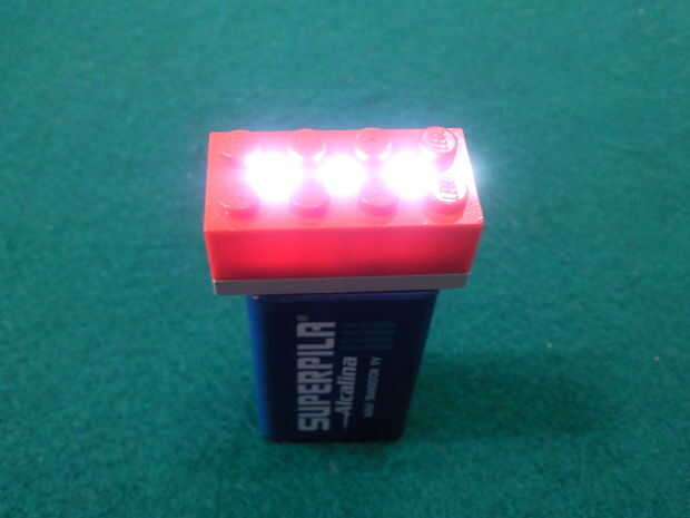 Hay un montón de 9V linternas instructables. Mina sólo aprovecha el ajuste perfecto de LEDs de 5mm en los agujeros de las piezas del clásico ladrillo de LEGO y el fino y "Pagué por él" aspecto del ladrillo.