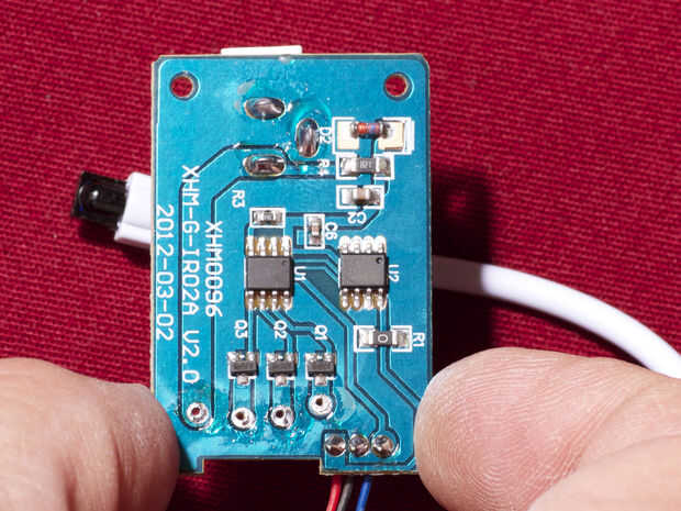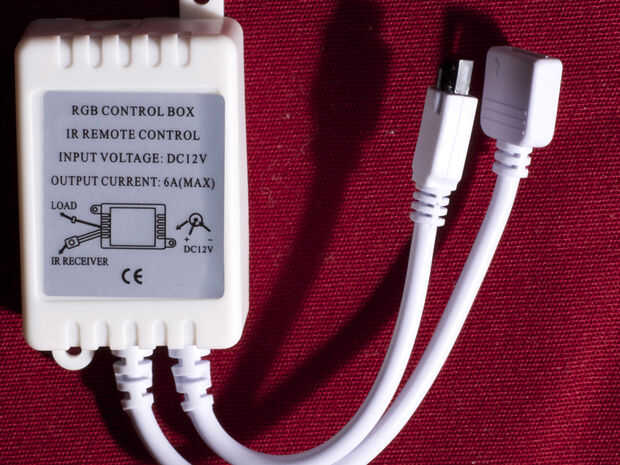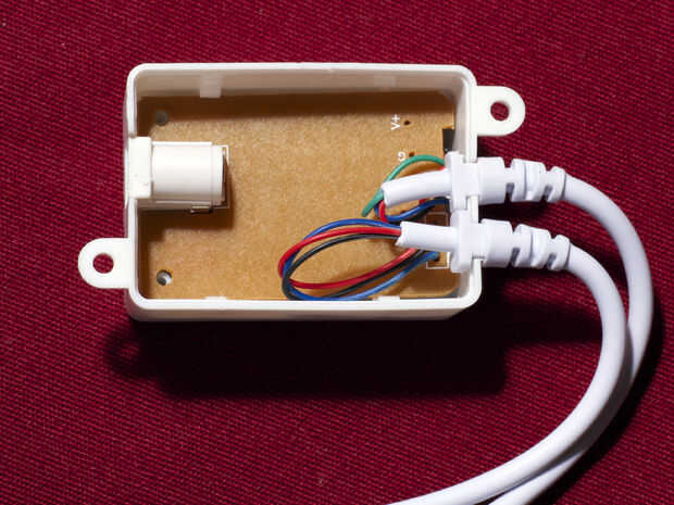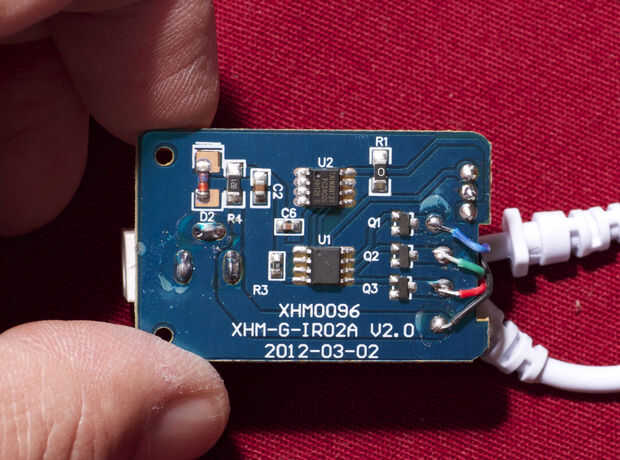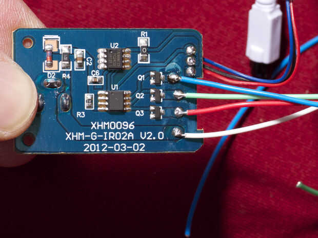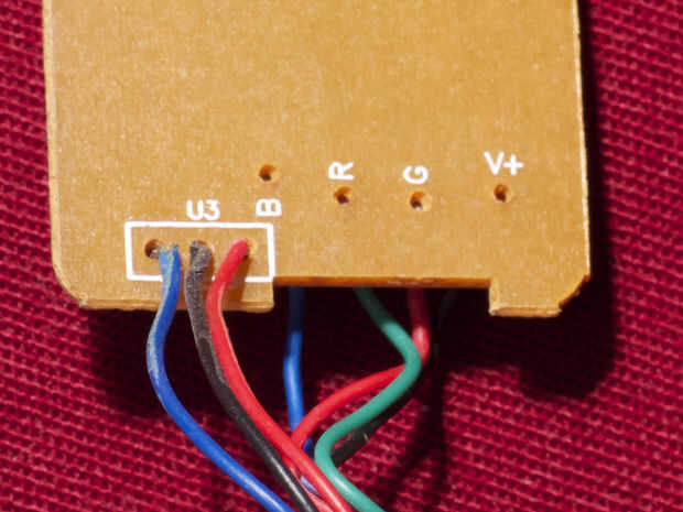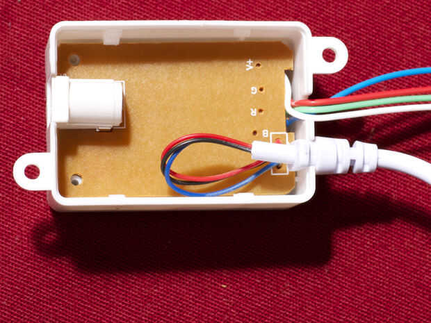 Utilice un destornillador pequeño para la caja abierta. Pop con cuidado la placa de circuito fuera del recinto. Se llevó a cabo en por topes de plástico pequeño que se pueden empujar más hacia un lado. Hay dos cables saliendo de él. Uno para el sensor de infrarrojos y la otra para las conexiones del LED. Es la que vamos a quitar y sustituir con el alambre conduce. Retire la placa de circuito y dale la vuelta. Verás un cable rojo, verde, azul y negro. El negro es el cable común (+) y los otros son los colores de los LED. Usé algunos mecha de soldadura para limpiar los agujeros de la PCB. Por desgracia he encontrado que los agujeros son demasiado pequeños para poner un cable 22 calibre en así que había soldado mis cables directamente a los rastros de PCB donde los otros fueron. Curiosamente me di cuenta de dos cosas, primero los cables originales no fueron soldados a través de los orificios bien y, al otro lado de la Junta está etiquetado como "R" "G", "B" pero el rojo y el verde eran diferentes de los colores de los cables originalmente conectados. Una de las grandes quejas acerca de estos controladores baratos es que a veces se intercambian los colores. Una vez han soldado en tus leads o un pedazo largo de cable de 4 conductores, es hora de cerrar el caso, copia de seguridad. Cuidadosamente vuelva a colocar el PCB en el caso garantizando los cables de LED no enganchados. Cuando se asiente el PCB, pueden aparecer la cubierta nuevamente en su lugar.
