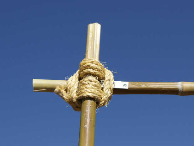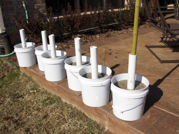 Hice está parado para la linterna de bambú. Pasa a crecer en unos lugares cerca de mí en Dallas Texas. (Estoy seguro de que no es nativa)! y hay un lugar donde la gente va a cortar un trozo para cañas de pescar y otras cosas. Cortar seis piezas de 7 pies de largo para el soporte y luego seis secciones de 3 pies de un travesaño. He intentado utilizando cordeles gruesos del latigazo pero terminó siendo demasiado flexible. Así que utilicé 2" abrazaderas de ángulo compré de Lowes y luego los cubrieron con la guita que atacó para conseguir el look que quería. A continuación os pongo ganchos de ojo pequeño en el extremo del pedazo de tres pies de bambú para colgar los faroles de. Ahora, qué usar para un soporte para sostener el bambú... Compré unos cubos de dos galones y algunos tubos de PVC de 2" y usado para sostener el tubo de PVC en el centro. Esto era probablemente exagerada pero corría corto el tiempo y me pareció una buena idea en el momento.  Ahora tengo seis de ellas y no sé dónde almacenarlos!