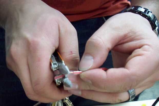 Quitar el aislante que cubre la porción del metal del alambre con un cuchillo o hilo stripper para exponer los extremos del alambre alrededor de un cm de largo.