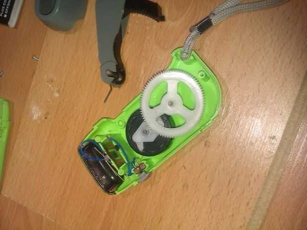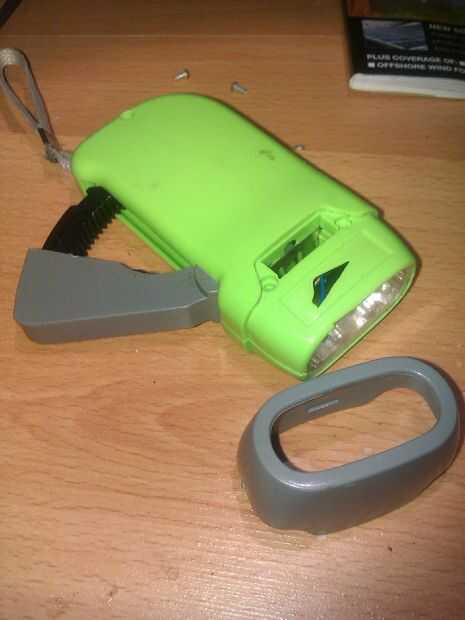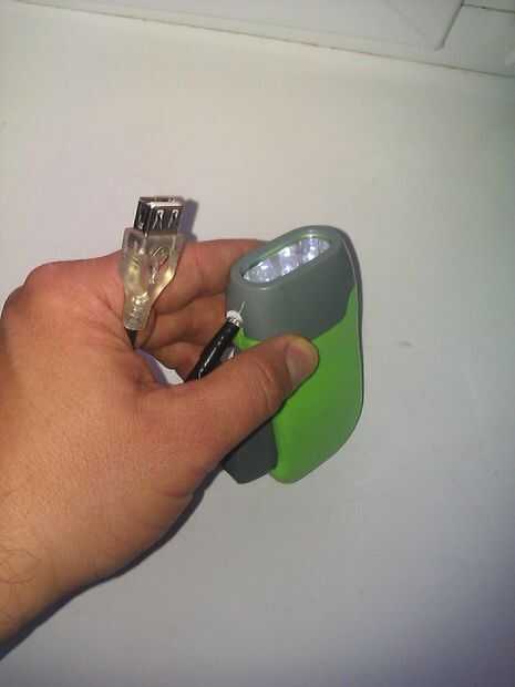 Aquí en Rusia la gente vende cosas en los trenes de cercanías. Así que una vez compré esta linterna avanzado de mano muy barata de 100 rublos (~ $3 US). Trabajó muy bien. Tuve que tomar aparte. En el interior estaban dos pilas de 3 voltios en serie, lo que significa que el dínamo dentro de la unidad había generada alrededor de 6 vdc. Inmediatamente soldar un cable usb y este había hecho en un mano manivela Cargador para mi teléfono Android.
