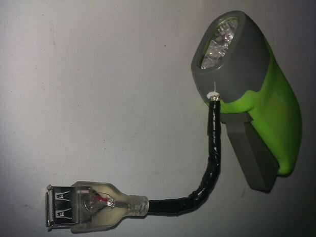 Aquí hay algunas fotos de linterna ser tomado aparte y un USB conector están soldada a él. Para averiguar la polaridad y cómo al operario conectar la línea de usb he leído esta página: http://pinouts.ru/Slots/USB_pinout.shtml