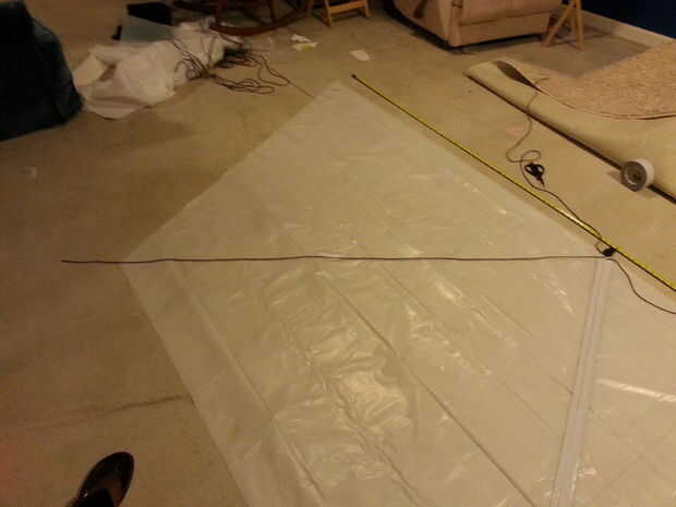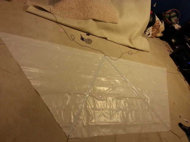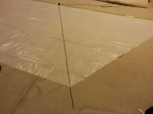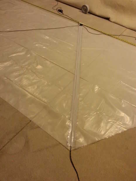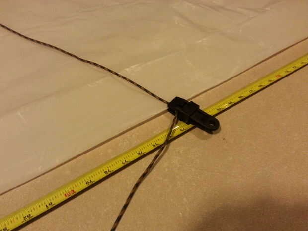 Usé algo de blanco, duro de Scotch, cinta adhesiva para adherir la línea a la lona. La cinta sí mismo viene en un rollo de 135 pies y cuesta alrededor de $8, que es bastante para cerca de 3 lonas. Puse cinta de aproximadamente 1/2 pulgadas de la abrazadera y 1/2 pulgadas desde el borde del plástico.