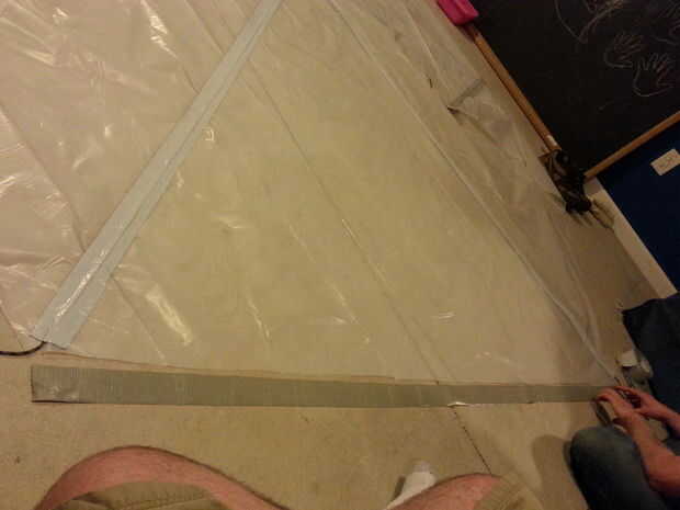 Con todas las líneas en su lugar, quería añadir algo extra de fuerza a los bordes de la lona. Sacó alguna cinta que sería tiempo suficiente para un lado y lo colocó boca abajo (lado pegajoso hacia arriba). Suavemente levantó el plástico y se tiró a medio camino sobre la cinta. Doblé a la cinta restante.