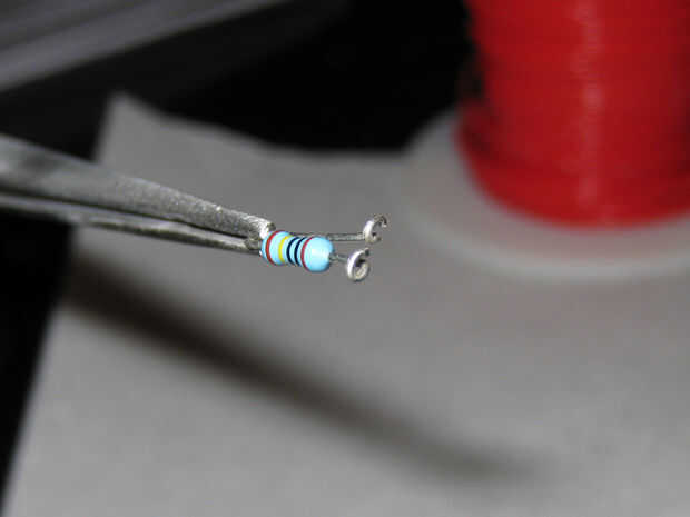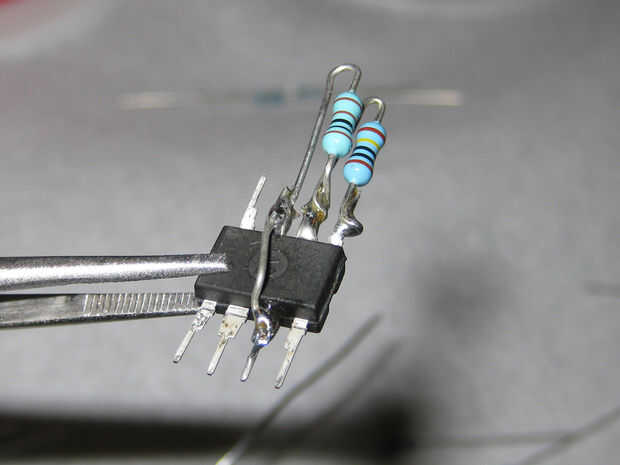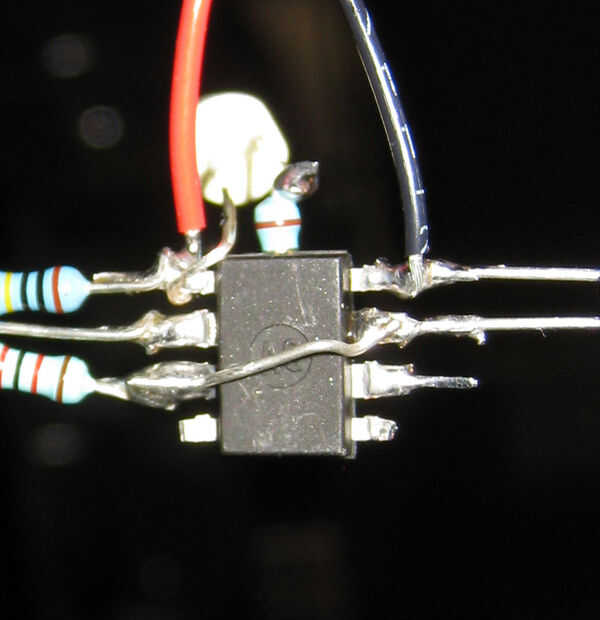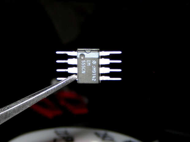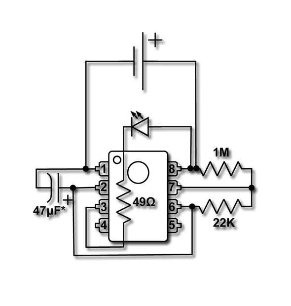 Tomar el IC 555 temporizador y doblar los cables directamente. Vamos a montar todos los componentes en los conductores. Ver el esquema para un diseño de cómo va todo. Cortar y doblar las puntas de la resistencia de 1 megohmio para que puede montarlo como se muestra entre los pines 7 y 8. Suelde la resistencia a la 555. Ahora toma el resistor de 22K y conectarlo al Pin 6 y 7 usando la misma técnica. Voltee el 555 y usando una pieza extra de plomo de las resistencias, hacer una conexión entre el Pin 2 a Pin 6. Volviendo al frente, como se muestra la forma del resistor del ohmio de 49 y conectarse dejando el otro cable hacia arriba para conectar el LED del Pin 3. Funciona de la manera el 555, la salida se mantiene alto por un tiempo basado en la resistencia de 1M más el resistor de 22K como las cargas del condensador, luego baja para un a corto plazo basado en la resistencia de 22K descarga el condensador. Para llegar a ser la mayoría del tiempo y en un rato el LED, conectar el cátodo a la salida del 555 y el ánodo a la + de la fuente. Ahora Conecte el LED entre el resistor del ohmio de 49 y el pin 8 de la 555. El condensador es el siguiente y va entre el pin 1 (-) y el Pin 2 (+). Estamos utilizando un condensador electrolítico que está polarizado. Hay una bonita raya en él identificar el cable (-). OK ahora para el valor. En el video usé un 4,7 uF una para que sea flash más rápido. Para un efecto real de la luciérnaga, utilizar un entre un 22uF y 68uF por más tiempo entre destellos. Si haces varios de estos, use condensadores de valor diferente para mezclar un poco. Ordené hacer un lote de 25 555. Por último, soldar cables cortos para grabar a las baterías. Rojo para (+) al Pin 8 y el negro para (-) al Pin 1. Antes de encender para arriba, revise tu cableado, que debe ser fácil de hacer como usted puede ver todo.