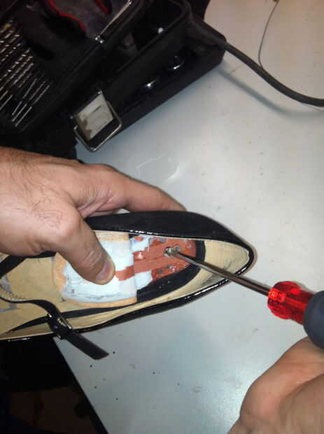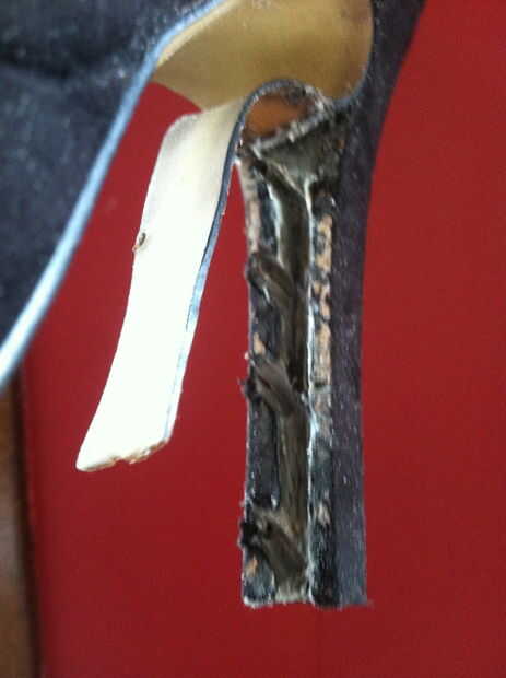 También debe pelar el vientre de su zapato fuera de la mama de talón usando un cuchillo del exacto y teniendo cuidado de no deslizarse para arriba. La imagen de este (abajo) es después del paso 4, por lo que puede parecer un poco diferente... usted consigue la idea sin embargo.