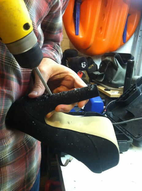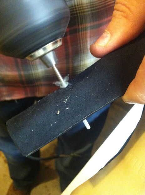 Debido al diseño de la zapata tuvimos que perforar en ángulo para evitar que la varilla en el talón. Perfore en los puntos que marcaste anteriormente y asegúrese de que el agujero que está en ángulo por lo que sale de la parte posterior en lugar de al lado.