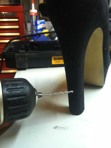 Elegir una broca que sea lo suficientemente fuerte para atravesar el material de los zapatos, pero no es demasiado grande; tienes que empezar pequeño y luego trabajar hasta el tamaño que se ajuste a tu LED. Nos miró fijamente con una madera de 3/32 bits y trabajó hasta una broca de 1/4 que se adaptan perfectamente a los LEDs de 5 mm.
