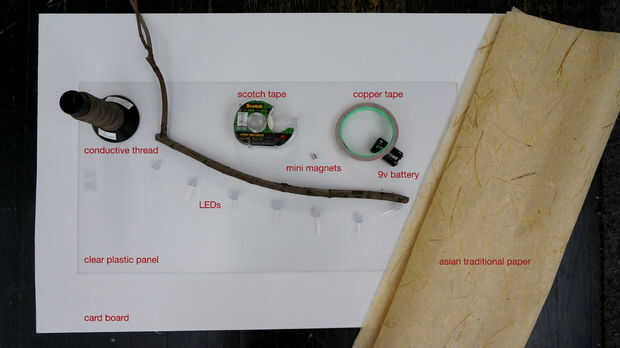 Materiales necesarios: Un tablero de tarjeta, un panel de plástico transparente, papel tradicional asiático, una rama, 6LEDs, cinta de cobre, batería de 9v, imanes, cinta Scotch, hilo conductor.