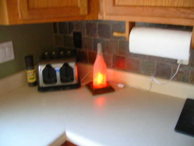 Ahora final de una prueba de ajuste después de que el pegamento se haya secado. Vuelva a colocar el enchufe en la base, inserte la bombilla, luego coloque la botella en la base. Encender la luz y ver cómo se ve.