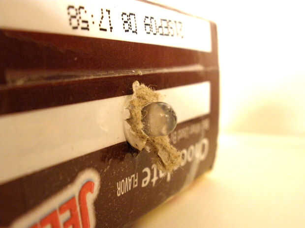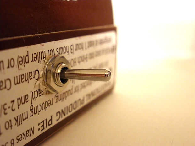 Luego se asoman agujeros para el LED y el interruptor. He utilizado el cuchillo de la caja para hacer X cortes utilizan un destornillador para limpiar el respiradero. En el lado del interruptor, que desea estar seguro no hacer el agujero demasiado grande. La tuerca del interruptor necesita algo para tomar a.