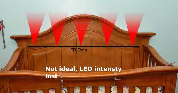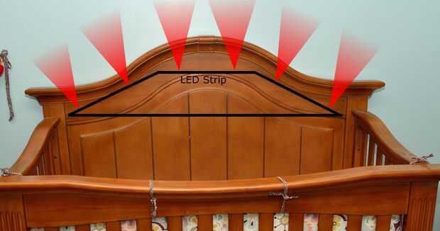 Si la cama tiene la espalda recta es una pieza sencilla. En mi caso la parte de atrás de la cuna las curvas y el uso de una pieza recta significa que gran parte de la intensidad del LED se pierde detrás de la cuna. Así que he creado la estructura en la foto. La idea es conseguir un contorno tan cerca de la cama hacia atrás como sea posible, pero ten en cuenta que no quieren la franja visible, por lo que debe ser 3 pulgadas o menos por debajo de la parte superior de la cabecera de la cama.