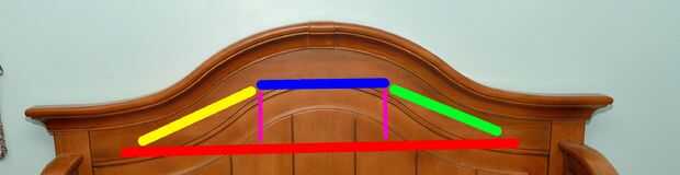En la parte posterior de la cama, utilice una cinta métrica y medir las líneas coloreadas en la imagen. Luego corte el tablero a la longitud de la línea roja. Cortar la otra tabla con la longitud de las líneas amarillo + azul + verdes. Medir y cortar dos varillas de la púrpura y taladre orificios de tamaño en el tablero de "rojo" y "tablero amarillo/azul/verde" correspondientes.