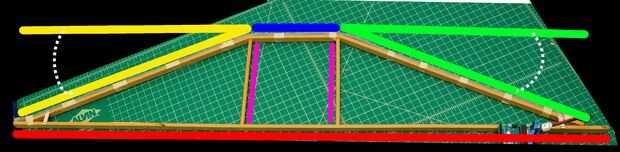 La idea ahora es las porciones amarillas y verdes abajo, hasta tocar la porción roja de la curva como se muestra en las líneas discontinuas. El MDF dará y desgarro en parte por la tensión de la curva que se produce donde la espiga púrpura reúne el Consejo superior. Ahora aplicar el pegamento para fijar la porción amarilla a la porción roja y la parte verde a la porción roja. Asegure en su lugar con una pinza o cinta como el pegamento se seca. Además aplica pegamento en la lágrima. Tenga en cuenta esta estructura tendrá un peso muy ligero LED tira y Arduino, por lo que no es necesario llevar mucho peso.