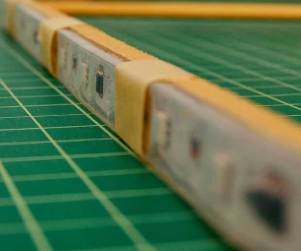 Tomar la cinta adhesiva y coloque la tira en la estructura de madera, teniendo cuidado de que la cinta no trata sobre los LEDs.