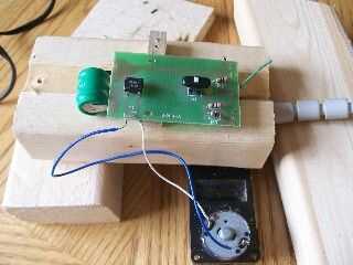En primer lugar, agregué un pequeño bloque hasta la base la Junta de la superficie y hacer espacio para la batería. A continuación se empuja la lámpara base en el agujero hasta que fue ajustada, correr los cables hacia abajo de la zanja de escape que había cortado.