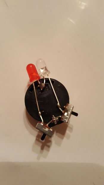 El siguiente paso es agregar los interruptores de batería th establecido. Esto se hace hecho recortando uno de los cables exteriores del interruptor y electro a la restante lleva a hacer contacto con el borne positivo de la batería y el positivo del led. Conecte ambos interruptores y probar el circuito añadiendo una batería y encender los leds.