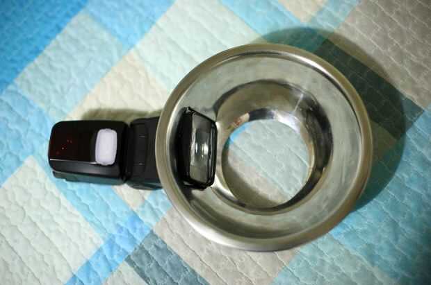 Se trata de un modificador barato para Alien Bee luces estroboscópicas. Crea una luz muy similar a un flash de anillo. El costo es alrededor de $6.Materiales:Plástico de 16" diámetro / 5" profunda pileta de lavado (almacén del dólar)Plástico de