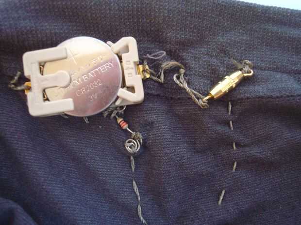 El otro extremo de la hebilla se conectará al extremo (-) de los LEDs. Coser alrededor al lado de las polainas y terminar en el primer LED cosido en.