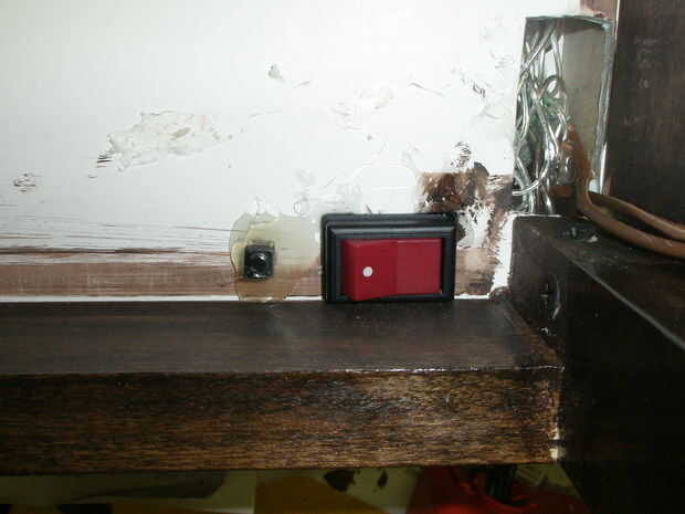 En primer lugar, desoldar el pulsador en el tablero (Asegúrese de que marcar los cables) y el cable de la pared principal. A continuación, cortar dos agujeros en la parte inferior de la placa de fondo: un agujero para el botón y otro agujero para el interruptor de encendido/apagado. Inserte ambos interruptores en cada uno de sus agujeros respectivos.