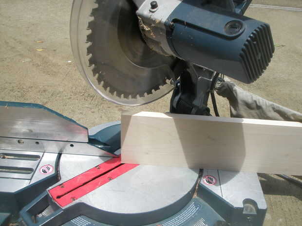 En primer lugar, vamos a empezar con las piernas. Tome su cuatro 2x2s y marca en 17 pulgadas. La tronzadora y sin encender, bajar la cuchilla y línea del borde de la hoja con la línea. Encienda la sierra y asegurándose de que no hay partes del cuerpo están cerca de la cuchilla y el pedazo de madera asegurado, vio a través de él. Después de que han cortado todas las cuatro piezas de esta manera, puede alinear todos los extremos de la sierra y afeitado apagado un pedacito pequeño del otro extremo de todas las piezas al mismo tiempo para asegurar una longitud incluso a las piernas.