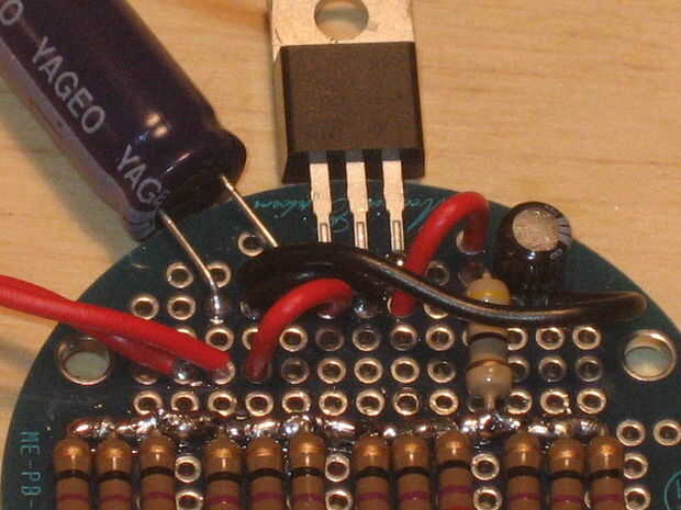 terrenos juntos - el terminal negativo del capacitor de 1000uF, el terminal negativo del capacitor de 10uF y el pasador central negativa de nuestro regulador de voltaje. Por último, un sexto cable se agrega al conectar la clavija de salida del regulador de tensión - el eje derecho - a la parte superior de la resistencia de 47 ohm.