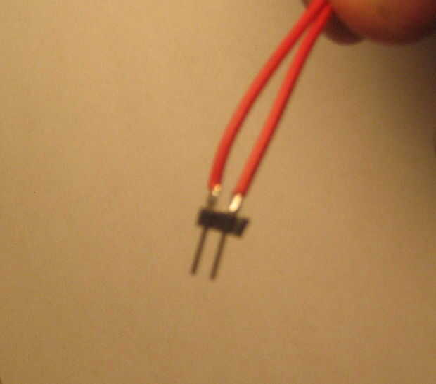 De la soldadura de los extremos sueltos de los dos cables "switch" en un un dos pines.  Estos dos pines ahora nos permitirá cambiar el voltaje de entrada y.  Por el momento, puso en cortocircuito estos dos pines juntos utilizando un puente de repuesto que tenía en mi caja de herramientas.  Con el jumper en su lugar, el circuito sería encender en cuanto conectado el adaptador de corriente.