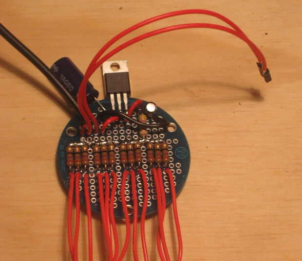 Ahora que sabemos que nuestros doce resistores están conectados a precisamente el voltaje correcto, es hora de darle ese poder algún lugar para ir.  Cortar 12 tiras de alambre, cada uno de aproximadamente cinco pulgadas de largo y una longitud en el orificio adyacente a la parte inferior de cada resistencia de 27 ohm de la soldadura.  Agregar una Junta de soldadura en la parte inferior de la Junta para conectar el cable a la resistencia, asegúrese de que no corta ninguna resistencia o alambre a su vecino.  Un solo cinco pulgadas largo cable también debe añadirse para la tierra y puede conectarse a cualquier suelo fácilmente accesible que hemos establecido hasta ahora.  Que mina conectado a la terminal negativa del capacitor de 10uF.