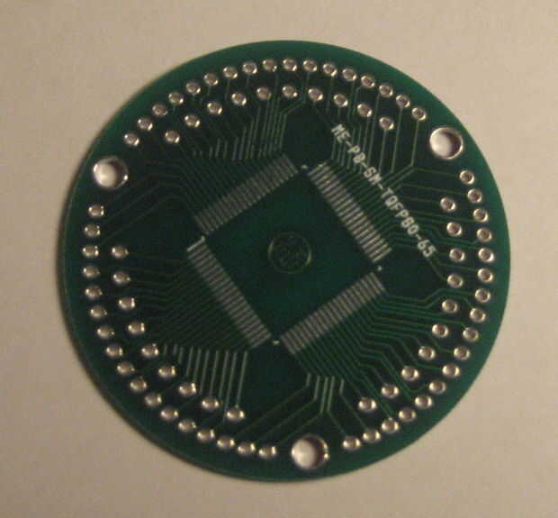 El tablero superior comienza su vida como este protoboard.  Esto está diseñado para alojar un chip de procesador de 80 pin llamado TQFP, o paquete plano.  Usando dos anillos de la viruta de los agujeros de la soldadura, pero no tienen necesidad para las almohadillas de soldadura en el centro del tablero donde normalmente iría el chip TQFP.  También, hemos enhebrado los doce hilos rojos en el paso anterior hacia arriba para conectar esta placa, que significa que necesitamos hacer un agujero a través del centro de esta placa por lo que tenemos en algún sitio el funcionamiento los cables en los orificios.