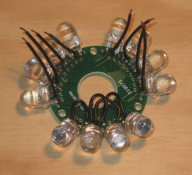 Necesitamos conectar el terminal negativo o cátodo de cada LED a tierra.  Cuatro cables cortos, uno para cada LED, es necesario soldar en el anillo exterior de los agujeros en el tablero de proto.  Cada uno de estos cables debe ser conectado vía un empalme de soldadura en la parte inferior del tablero para el polo negativo del LED adyacente.  El alambre entonces debe ser doblado hacia atrás y tiene su otro extremo soldada al anillo interior de agujeros.  Esto nos permite conectarse más fácilmente todos estos motivos juntos.  Aquí vemos dos juegos de cables que se han añadido y todavía necesitan estar conectado para el anillo interior de los agujeros, así como un conjunto de cables que se ha conectado correctamente.