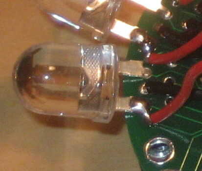 Aquí vemos una ampliación de una sección de la foto del paso anterior, que se indique claramente el cable rojo de la parte inferior y la soldadura común de conexión al ánodo del LED.  Encontré que los cables restantes rojos pueden necesitar ser empujado fuera del camino para alcanzar correctamente el ánodo del LED con el soldador.