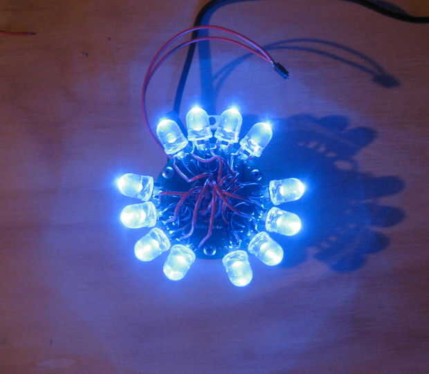 Una vez que has jodido los dos tableros juntos, la luz nocturna sí mismo está ahora completada!  Prueba tu lamparita enchufando el adaptador de corriente.  Si los cables del interruptor (visibles en la parte superior de esta foto) están juntos todavía puenteados, inmediatamente debe encender su luz nocturna y todos los LEDs deben ser que brilla intensamente brillantemente.